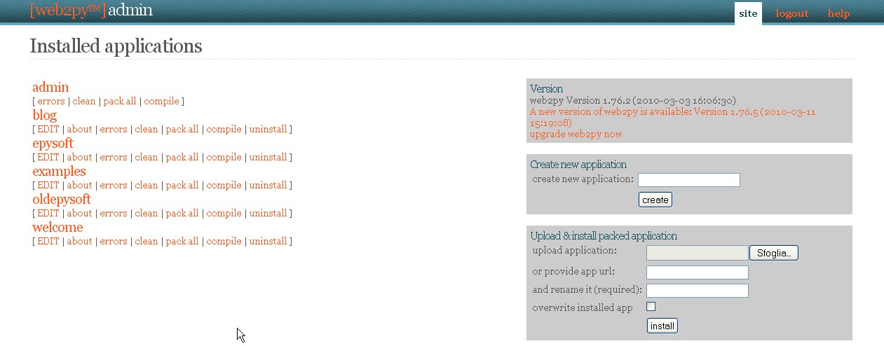 Upload & Install new application: utile per installare nuove aplicazioni già pacchettizzate (ne trovate molte sul sito web2py.com);