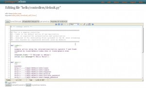 Concentriamoci per il momento sulla nostra prima applicazione che non utilizza alcuna base di dati (per il momento) e quindi procediamo alla sezione Controllers: come detto esistono due controller di default già pronti, il primo appadmin.py ci permette di amministrare la base dati (creazione di tabelle, query, insert, update, delete ecc) e di questo al momento non abbiamo bisogno in quanto non utilizzeremo alcuna base dati; il secondo default.py (che di default, come vediamo dai link relativi, espone le azioni di default index, user, download e call) è quello che ci serve e che andremo ad editare attraverso il link EDIT. Fughiamo subito un dubbio: il framework permette di editare i vari file attraverso il suo editor interno restando all’interno della interfaccia web, ma questo non significa che non possiate utilizzare qualsiasi editor di vostro piacimento sia per i file python (Wing, Eclipse e mille altri) che per i file html e javascript. L’editor interno deve essere visto come un plus, magari comodo per ritocchi rapidi di emergenza e non come la regola che web2py vuole imporre al programmatore. Per questo semplice esempio utilizzeremo l’editor integrato, facciamo clic su EDIT (accanto alla voce default.py). ed ecco l’editor che ci mostra il contenuto del file default.py. L’azione (funzione di python) che ci interessa modificare è index, cioè quella che sarà invocata di default al lancio della nostra applicazione. Cancelliamo tutto quello presente di default al di sotto della dichiarazione della funzione “def index():” e scriviamo il seguente codice: