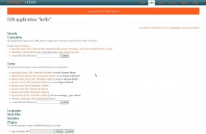 Automaticamente vengono create tutta una serie di cartelle predefinite e veniamo reindirizzati sulla pagina di amministrazione della nostra nuova applicazione ed in cui le voci amministrative sono divise in 6 gruppi, tre dei quali relativi alla filosofia MVC che sta alla base del framework: